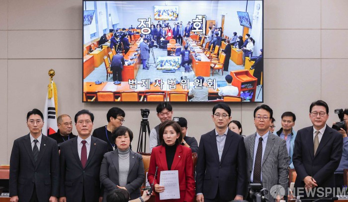 | [서울=뉴스핌] 윤창빈 기자 = 나경원 국민의힘 의원 등 국회 법제사법위원회 소속 국민의힘 의원들이 11일 서울 여의도 국회에서 열린 법제사법위원회 전체회의가 정회된 후 대장동 항소 포기 관련 긴급현안질의가 열리지 않자 입장을 밝히고 있다. 2025.11.11 pangbin@newspim.com |