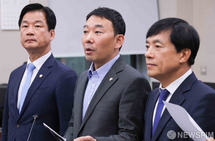 | [서울=뉴스핌] 윤창빈 기자 = 김용민 국회 법제사법위원회 더불어민주당 간사 등 소속 의원들이 11일 서울 여의도 국회에서 열린 법제사법위원회 전체회의가 정회된 후 대장동 항소 포기 관련 긴급현안질의와 관련해 입장을 밝히고 있다. 2025.11.11 pangbin@newspim.com |