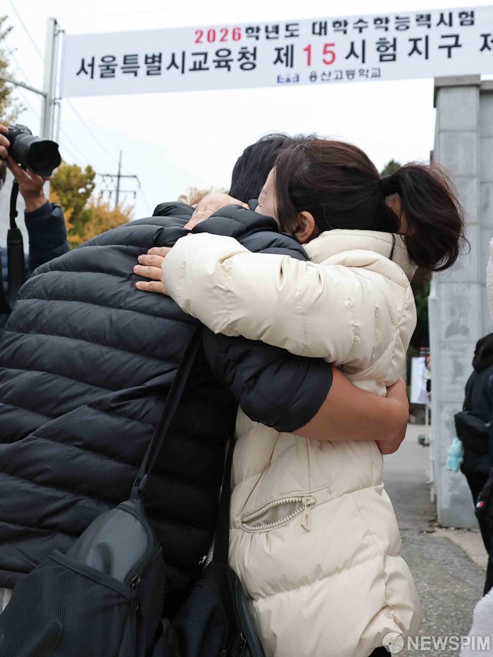 [서울=뉴스핌] 윤창빈 기자 = 2026학년도 대학수학능력시험이 실시된 13일 오전 서울 용산구 용산고등학교에서 한 수험생이 어머니와 포옹을 하고 있다. 2025.11.13 pangbin@newspim.com
