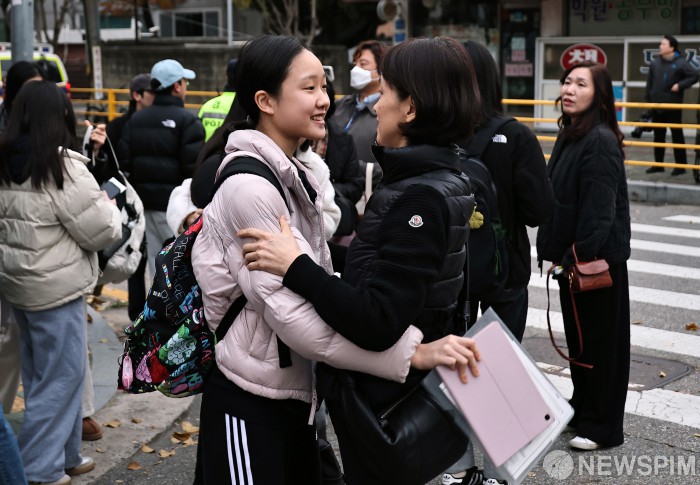 [서울=뉴스핌] 사진공동취재단 = 2026학년도 대학수학능력시험이 치러진 13일 오전 서울시교육청 제20시험지구 제3시험장인 서울 광진구 광남고에서 한 수험생이 입장을 앞두고 어머니와 포옹을 하고 있다. 2025.11.13 photo@newspim.com