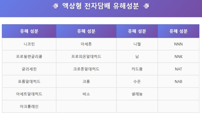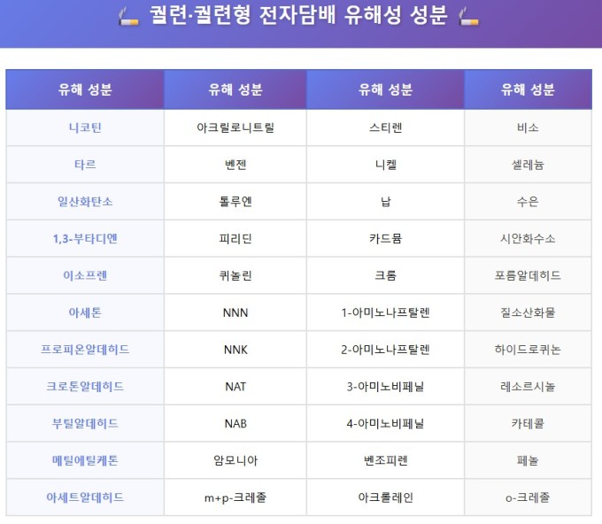 [세종=뉴스핌] 신도경 기자 = 니코틴, 아세톤 등이 담배 유해 성분에 지정됐다. 궐련·궐련형 전자담배에서는 44종, 액상형 전자담배에서는 20종이다.