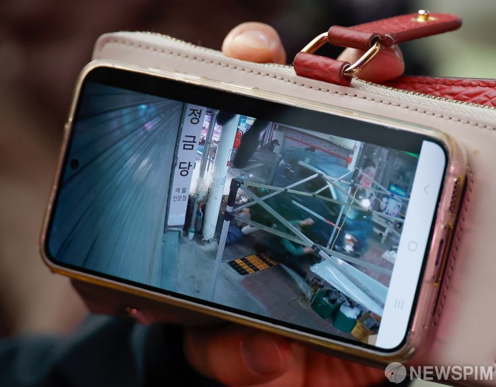 [부천=뉴스핌] 류기찬 기자 = 13일 경기 부천시 오정구 제일시장에서 A씨가 몰던 1톤 트럭이 돌진하는 사고가 발생한 가운데 시장 상인이 사고 당시 CCTV 영상을 취재진들에게 보여주고 있다. 2025.11.13 ryuchan0925@newspim.com