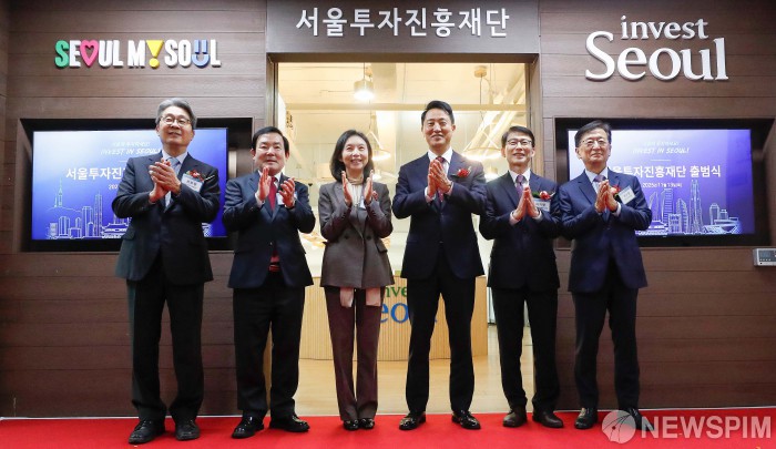 [서울=뉴스핌] 류기찬 기자 = 오세훈 서울시장 등 참석자들이 13일 오전 서울 종로구 서울글로벌센터에서 열린 서울투자진흥재단 출범식에서 현판식을 마친 뒤 기념사진을 촬영하고 있다. 2025.11.13 ryuchan0925@newspim.com