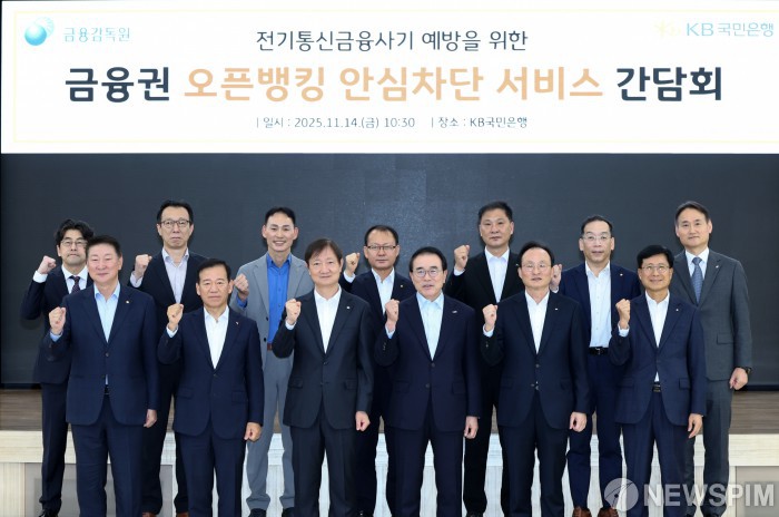 [서울=뉴스핌] 최지환 기자 = 이찬진 금융감독원장이 14일 오전 서울 영등포구 KB국민은행 여의도영업부에서 열린 금융권 오픈뱅킹 안심차단 서비스 간담회에서 참석자들과 기념촬영을 하고 있다. 2025.11.14 choipix16@newspim.com