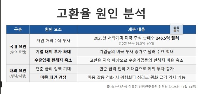 이 연구위원은 "연준의 금리 인하에 대한 기대와 AI(인공지능) 낙관론 등에 해외 주식 투자가 역대 최대 수준으로 이뤄지면서 달러 수요가 급증한 측면이 원화 약세 요인으로 작용했다"며 "여기에 기업들이 대미투자 확대로 인한 달러 수요 증가, 고환율이 지속될 것으로 예상되는 수출업체들의 환해지 비율 축소 가능성도 영향을 미쳤을 것"이라고 말했다.