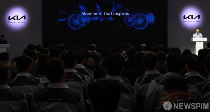[화성=뉴스핌] 청사사진기자단 = 송호성 기아차 사장이 14일 경기도 화성시 우정읍 기아오토랜드 화성에서 열린 기아 화성 EVO 플랜트 East 준공식 & West 기공식에서 환영사 및 기아 PBV 전략 발표를 하고 있다. 2025.11.14 photo@newspim.com