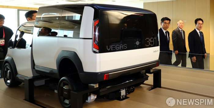 [화성=뉴스핌] 청사사진기자단 = 김민석 국무총리와 정의선 현대차그룹 회장, 송호성 기아차 사장이 14일 경기도 화성시 우정읍 기아오토랜드 화성 내 화성대에서 미래차 산업전략 대화를 위해 이동하고 있다. 2025.11.14 photo@newspim.com