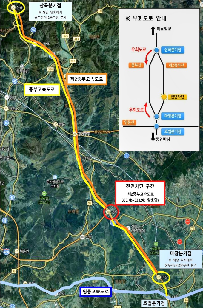 도공에 따르면 차단 시간은 18일 오전 10시부터 10시 10분, 오후 1시부터 1시 10분, 오후 3시부터 3시 10분으로 3차례 각 10분씩 전면 차단되며 교통 불편을 최소화하기 위해 중부고속도로(호법∼하남 구간)을 우회도로로 활용할 것을 운전자들에게 당부했다.