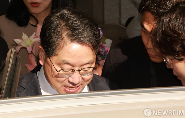 [서울=뉴스핌] 김학선 기자 = '대장동 개발 비리 사건' 항소 포기 논란 끝에 사표를 낸 노만석 검찰총장 권한대행이 14일 오전 서울 서초구 대검찰청에서 열린 비공개 퇴임식을 마치고 차량에 타고 있다. 2025.11.14 yooksa@newspim.com