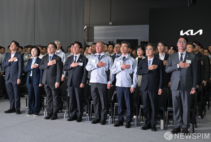 [화성=뉴스핌] 청사사진기자단 = 김민석 국무총리와 정의선 현대차그룹 회장을 비롯한 참석자들이 14일 오전 경기도 화성에서 열린 기아 화성 EVO 플랜트 East준공식 및 West기공식에서 국민의례를 하고 있다. 왼쪽부터 이준석 개혁신당 대표, 송옥주 더불어민주당 의원, 문신학 산업통상부 1차관, 김 총리, 정 회장, 송호성 기아 사장, 김동연 경기도지사, 정명근 화성시장. 2025.11.14 photo@newspim.com