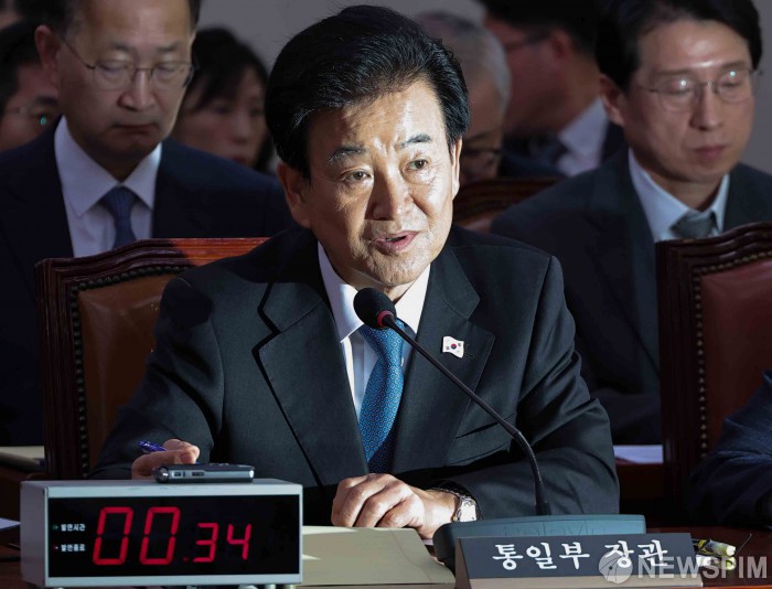 [서울=뉴스핌] 윤창빈 기자 = 정동영 통일부 장관이 14일 서울 여의도 국회에서 열린 외교통일위원회 전체회의에서 의원 질문에 답변하고 있다. 2025.11.14 pangbin@newspim.com