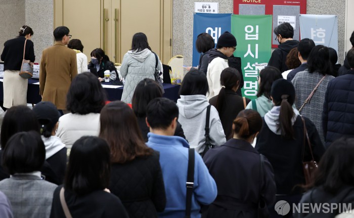 [서울=뉴스핌] 최지환 기자 = 14일 오후 서울 광진구에서 열린 종로학원 2026학년도 정시 합격점수 예측 및 전략 설명회에서 학부모 및 수험생들이 입장을 대기하고 있다. 2025.11.14 choipix16@newspim.com