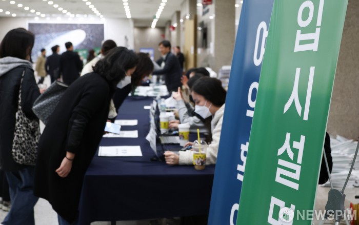 [서울=뉴스핌] 최지환 기자 = 14일 오후 서울 광진구에서 열린 종로학원 2026학년도 정시 합격점수 예측 및 전략 설명회에서 학부모 및 수험생들이 입장을 대기하고 있다. 2025.11.14 choipix16@newspim.com