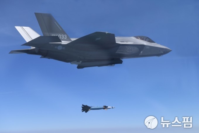 한국 공군의 최신예 F-35A 스텔스 전투기가 2024년 4월 19일 강원도 태백 필승사격장에서 지상 표적을 향해 GBU-12 공대지 미사일을 발사하고 있다. [사진=공군]