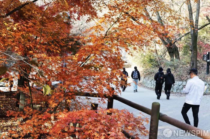 [서울=뉴스핌] 양윤모 기자 = 휴일인 16일 서울 북한산국립공원을 찾은 시민들이 아쉬운 가을의 끝자락에 붉게 피어난 단풍을 즐기고 있다. 2025.11.16 yym58@newspim.com