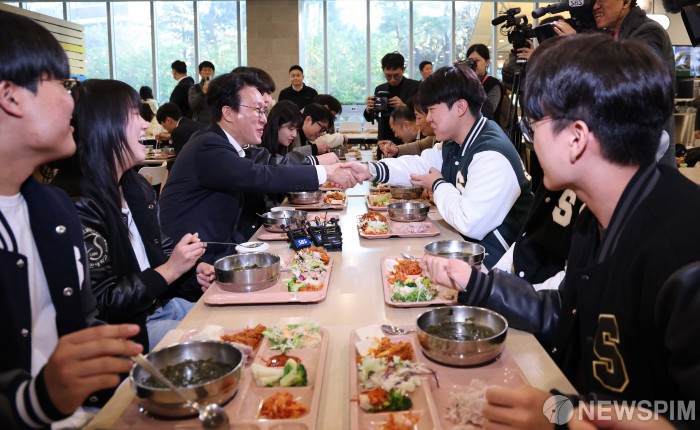 [서울=뉴스핌] 청사사진기자단 = 김민석 국무총리가 17일 오전 서울 종로구 성균관대학교 은행골식당에서 학생들과 함께 '천원의 아침밥' 식사를 하며 이야기를 나누고 있다. 2025.11.17 photo@newspim.com