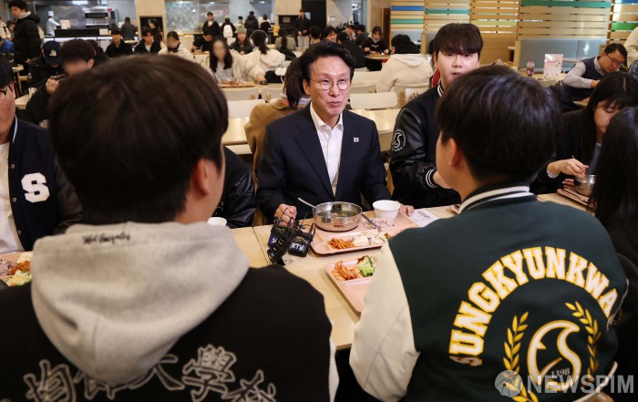 [서울=뉴스핌] 청사사진기자단 = 김민석 국무총리가 17일 오전 서울 종로구 성균관대학교 은행골식당에서 학생들과 함께 '천원의 아침밥' 식사를 하며 이야기를 나누고 있다. 2025.11.17 photo@newspim.com