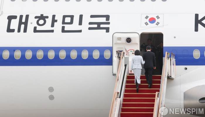 공군 1호기 오르는 이재명 대통령 부부