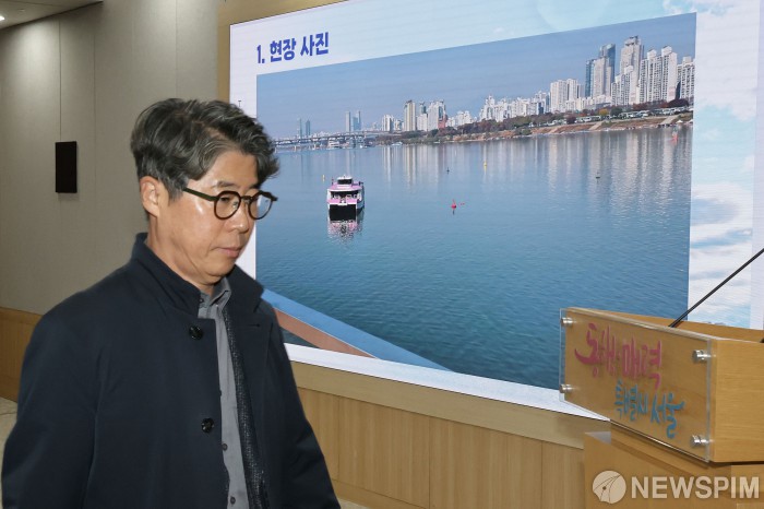 [서울=뉴스핌] 양윤모 기자 = 김선직 (주)한강버스 대표가 17일 오전 서울시청에서 한강버스 멈춤사고 관련 브리핑을 하기위해 입장하고 있다. 15일 저녁 잠실선착장서 100m 떨어진 지점에서 승객 82명이 탑승한 102호 한강버스가 강바닥에 걸려 멈추는 사고가 발생해 잠실~압구정 구간 운행이 중단된 상태이며 19일 19시에 이동할 예정이다. 김민석 국무총리는 16일 사고 원인 규명과 안전 대책 점검을 지시했으며,오세훈 서울시장은 “승객 여러분께 불안과 불편을 끼쳐드려 송구하다”고 고개를 숙였다. 2025.11.17 yym58@newspim.com