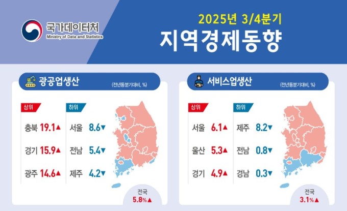 광공업 생산은 전국 10개 시도에서 1년 전보다 증가했다. 평균 광공업 생산 증가율은 5.8%를 기록했다.