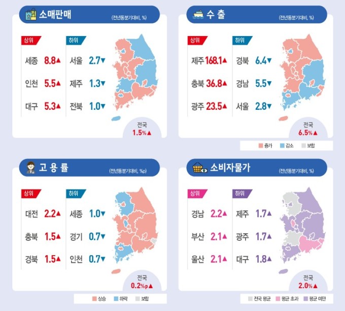 소매판매는 세종(8.8%), 인천(5.5%), 대구(5.3%) 등 11개 시도에서 증가했다. 전국 단위로 보면 승용차·연료소매점, 무점포 소매 등의 판매가 늘어 1년 전보다 1.5% 증가했다.