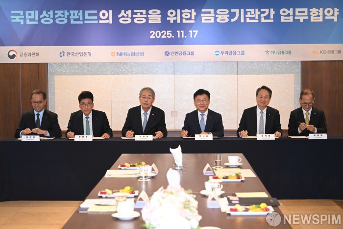 [서울=뉴스핌] 최지환 기자 = 박상진 산업은행 회장과 5대 금융지주 회장들이 17일 오후 서울 영등포구 산업은행 별관에서 열린 '국민성장펀드의 성공을 위한 금융기관간 업무협약식'에서 협약서에 서명을 하고 있다. 왼쪽부터 이찬우 NH농협금융 회장, 함영주 하나금융그룹 회장, 임종룡 우리금융그룹 회장, 박상진 회장, 진옥동 신한금융지주 회장, 양종희 KB금융지주 회장. 2025.11.17 choipix16@newspim.com