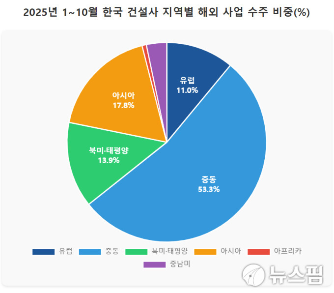 | 2025년 1~10월 한국 건설사 지역별 해외 사업 수주 비중(%) [그래픽=AI 제작] |
