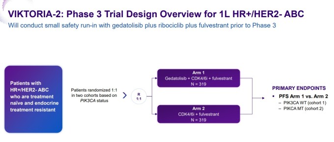 셀큐이티는 3상 VIKTORIA-2 임상시험도 진행 중이다. 지난 7월 첫 환자 투여를 시작한 이 연구는 내분비 치료에 내성이 있는 HR+/HER2- 진행성 유방암 환자를 대상으로 게다톨리십과 CDK4/6 억제제, 풀베스트란트 병용요법을 평가한다. 또한 통제되지 않는 당뇨병 환자를 제외한 광범위한 환자 적격성 기준에 초점을 맞추고 있어, PIK3CA 상태나 HbA1c 수치와 관계없이 게다톨리십을 다용도 치료 옵션으로 포지셔닝한다는 전략이다.