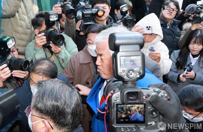 [서울=뉴스핌] 김학선 기자 = 서울서부지법 폭력 난동 사태의 배후로 지목돼 온 전광훈 사랑제일교회 목사가 18일 피의자 신분으로 서울경찰청에 출석하고 있다. 2025.11.18 yooksa@newspim.com