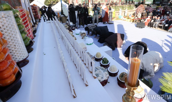 [서울=뉴스핌] 최지환 기자 = 18일 오후 서울 종로구 조계사에서 열린 산재사망 희생자 추모 위령재에서 유가족들이 헌향·헌다를 마치고 큰절을 하고 있다. 2025.11.18 choipix16@newspim.com