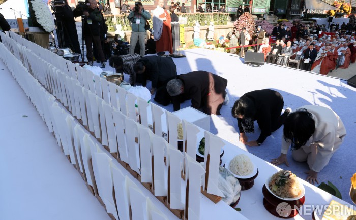 [서울=뉴스핌] 최지환 기자 = 18일 오후 서울 종로구 조계사에서 열린 산재사망 희생자 추모 위령재에서 유가족들이 헌향·헌다를 마치고 큰절을 하고 있다. 2025.11.18 choipix16@newspim.com