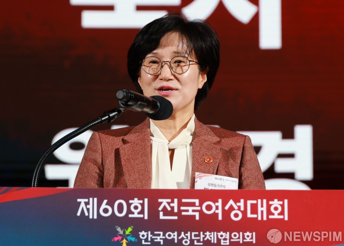 [서울=뉴스핌] 김학선 기자 = 원민경 성평등가족부 장관이 18일 서울 강남구 코엑스에서 '양성평등의 시대, 여성이 함께'라는 주제로 열린 제60회 전국여성대회에서 축사를 하고 있다. 2025.11.18 yooksa@newspim.com