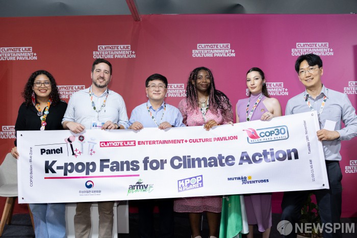 [서울=뉴스핌] 김성환 기후에너지환경부 장관이 18일(현지시간) 브라질 벨렝에서 열린 제30차 유엔기후변화협약당사국총회(COP30) 부대행사로 브라질 한국문화원이 주관한 'K-POP 기후행동'에서 관계자들과 기념촬영을 하고 있다. [사진=기후에너지환경부] 2025.11.19 photo@newspim.com