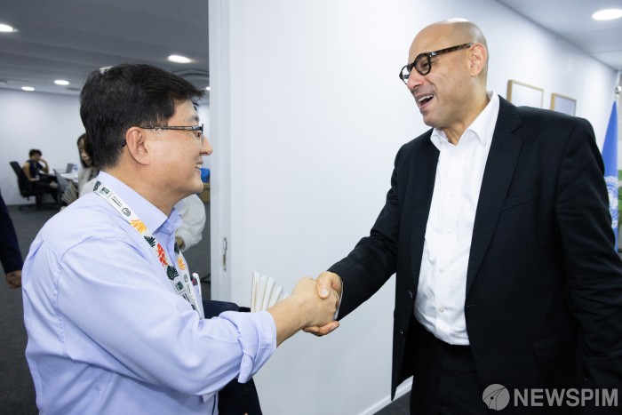[서울=뉴스핌] 김성환 기후에너지환경부 장관이 18일(현지시간) 브라질 벨렝에서 열린 제30차 유엔기후변화협약당사국총회(COP30)에 참석해 사이먼 스틸 유엔기후변화협약(UNFCCC) 사무총장과 만나 악수하고 있다. [사진=기후에너지환경부] 2025.11.19 photo@newspim.com