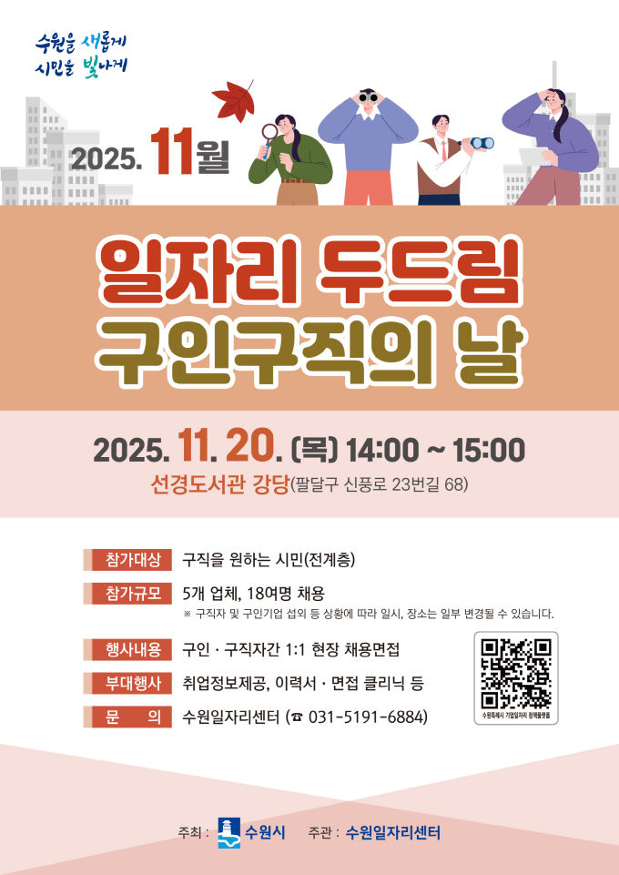 수원시 '11월 일자리 두드림 구인·구직의 날' 18명 채용 예정
