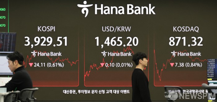 [서울=뉴스핌] 양윤모 기자 = 미국 뉴욕증시가 ‘AI 버블’ 논란으로 약세를 보인 가운데, 19일 오후 코스피가 전장 종가보다 24.11 포인트(0.61%) 하락하며 3929.51로, 코스닥은 7.38 포인트(0.84%) 하락한 871.32로 장을 마감한 가운데, 서울 중구 하나은행 딜링룸에서 직원들이 업무를 보고 있다. 서울외환시장에서 달러/원 환율은 전장 대비 0.10원 하락한 1465.20원에 주간거래를 마감했다. 2025.11.19 yym58@newspim.com