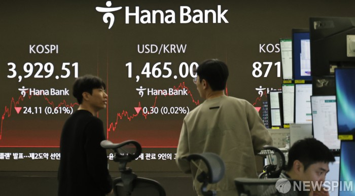 [서울=뉴스핌] 양윤모 기자 = 미국 뉴욕증시가 ‘AI 버블’ 논란으로 약세를 보인 가운데, 19일 오후 코스피가 전장 종가보다 24.11 포인트(0.61%) 하락하며 3929.51로, 코스닥은 7.38 포인트(0.84%) 하락한 871.32로 장을 마감한 가운데, 서울 중구 하나은행 딜링룸에서 직원들이 업무를 보고 있다. 서울외환시장에서 달러/원 환율은 전장 대비 0.30원 하락한 1465.00원에 주간거래를 마감했다. 2025.11.19 yym58@newspim.com