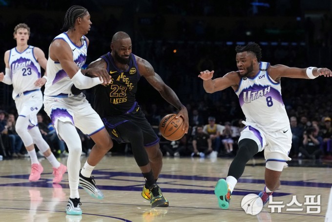 레이커스는경기 초반 유타의 외곽에 흔들렸다. 스비 미하일룩과 키욘테 조지에게 연속 3점포를 맞았다. 라우리 마카넨까지 가세하며 1쿼터를 27-36으로 뒤졌다. 2쿼터 들어 레이커스는 리브스를 중심으로 분위기를 바꿨다. 제임스가 남은 8분대에 시즌 첫 득점을 외곽에서 올리며 흐름을 잡았다. 조지의 연속 득점에 다시 밀렸지만 돈치치가 공격 전개를 정리했고 제임스와 리브스의 3점포가 이어지며 전반을 67-71로 마쳤다.