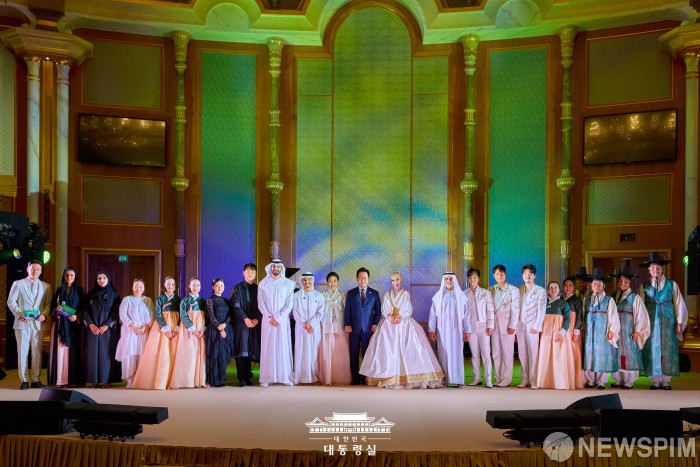 [서울=뉴스핌] 아랍에미리트를 국빈 방문 중인 이재명 대통령이 지난 18일(현지시간) 아부다비 대통령궁에서 열린 양국 문화교류 행사에서 출연진과 기념촬영을 하고 있다. [사진=대통령실] 2025.11.20 photo@newspim.com