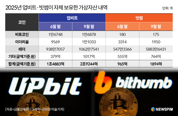 [서울=뉴스핌] 전미옥 기자 = 가상자산거래소 업비트(두나무)와 빗썸이 최근 자체 보유한 가상자산 비중을 각각 조정했다. 업비트는 비트코인, 이더리움 등 주요 가상자산 수량이 늘었고, 빗썸은 비트코인, 이더리움 일부를 매도한 대신 테더를 기존 대비 10배 이상 사들였다.