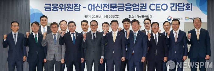 [서울=뉴스핌] 류기찬 기자 = 이억원 금융위원장(앞줄 왼쪽 여섯번째)과 참석자들이 20일 오전 서울 중구 여신금융협회에서 열린 ‘금융위원장-여신전문금융권 CEO 간담회’에서 기념촬영을 하고 있다. 2025.11.20 ryuchan0925@newspim.com