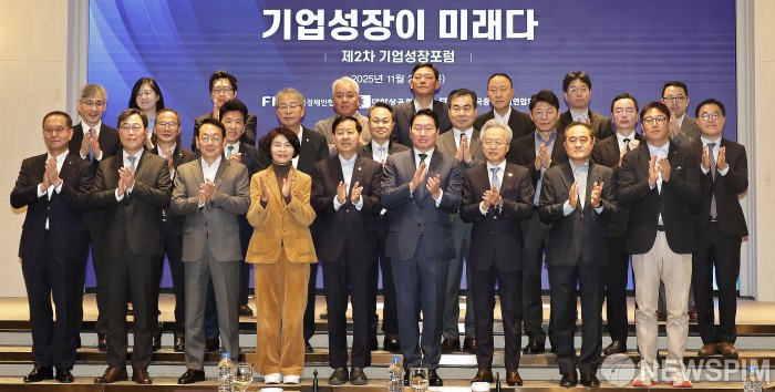 [서울=뉴스핌] 양윤모 기자 = 제2차 기업성장포럼이 20일 오전 한국경제인협회, 대한상공회의소, 한국중견기업연합회 공동 주최로 서울 여의도 CCMM빌딩에서 열렸다. 행사에는 최태원 대한상의 회장,정철 한경협 연구총괄대표 겸 한국경제연구원장,최진식 중견련 회장,구윤철 경제부총리, 한정애 더불어민주당 정책위의장, 김도읍 국민의힘 정책위의장, 김기식 국회 미래연구원장, 진옥동 신한금융지주 회장, 양종희 KB금융지주 회장, 함영주 하나금융지주 회장, 임종룡 우리금융지주 회장,이찬우 NH 농협금융지주 회장, 이형희 SK 부회장, 최승훈 삼성 부사장 등이 참석했다. 2025.11.20 yym58@newspim.com