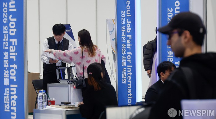[서울=뉴스핌] 류기찬 기자 = 20일 오후 서울 강남구 세텍 서울무역전시장에서 열린 ‘외국인 취업·채용 박람회'에서 구직자들이 서류를 살펴보고 있다. 2025.11.20 ryuchan0925@newspim.com
