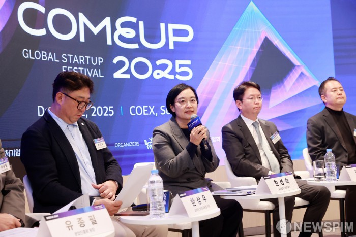 [서울=뉴스핌] 한성숙 중소벤처기업부 장관이 20일 서울 강남구 글로벌스타트업센터(GSC)에서 열린 컴업(COMEUP) 2025 미디어데이에서 발언을 하고 있다. [사진=중소벤처기업부] 2025.11.20 photo@newspim.com