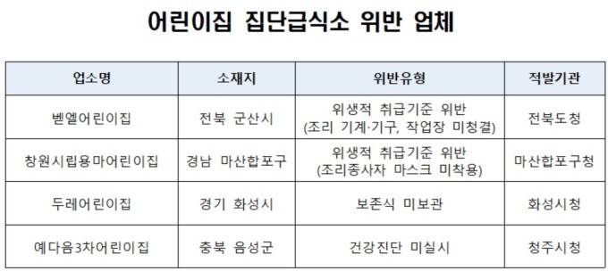 식약처는 "국민의 안전한 식생활 환경을 조성하기 위해 어린이집 등 집단급식소에 대한 위생 점검을 지속 실시할 계획"이라고 설명했다.