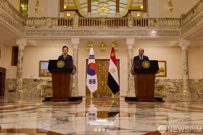 | [서울=뉴스핌] 이집트를 공식 방문 중인 이재명 대통령이 지난 20일(현지시간) 카이로 대통령궁에서 압델 파타 알시시 대통령과 한-이집트 공동언론발표를 하고 있다. [사진=대통령실] 2025.11.21 photo@newspim.com |