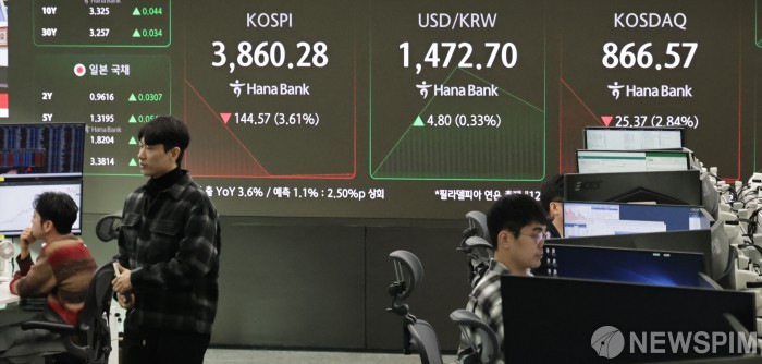 [서울=뉴스핌] 양윤모 기자 = 뉴욕증시가 인공지능(AI) 관련주 거품 우려 지속에 약세로 마감한 가운데, 21일 오전 코스피가 전장 종가보다 144.57 포인트(3.61%) 하락하며 3860.28로, 코스닥은 25.37 포인트(2.84%) 하락한 866.57로 장을 시작한 가운데, 서울 중구 하나은행 딜링룸에서 직원들이 업무를 보고 있다. 서울외환시장에서 달러/원 환율은 전장 대비 4.80원 상승한 1472.70원에 주간거래를 시작했다. 2025.11.21 yym58@newspim.com