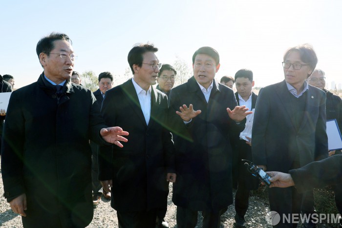 [인천=뉴스핌] 청사사진기자단 = 김민석 국무총리가 21일 인천 서구 수도권매립지를 방문해 3-1매립장 위생매립 현황 및 2매립장 상부공간 활용대책에 대해 브리핑을 받으며 유정복 인천시장 및 참석자들과 대화하고 있다. 2025.11.21 photo@newspim.com