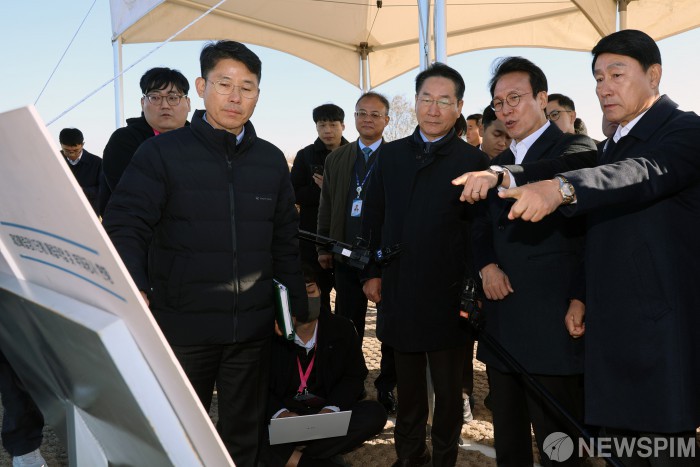 [인천=뉴스핌] 청사사진기자단 = 김민석 국무총리가 21일 인천 서구 수도권매립지를 방문해 3-1매립장 위생매립 현황 및 2매립장 상부공간 활용대책에 대해 브리핑을 받으며 유정복 인천시장 및 참석자들과 대화하고 있다. 2025.11.21 photo@newspim.com