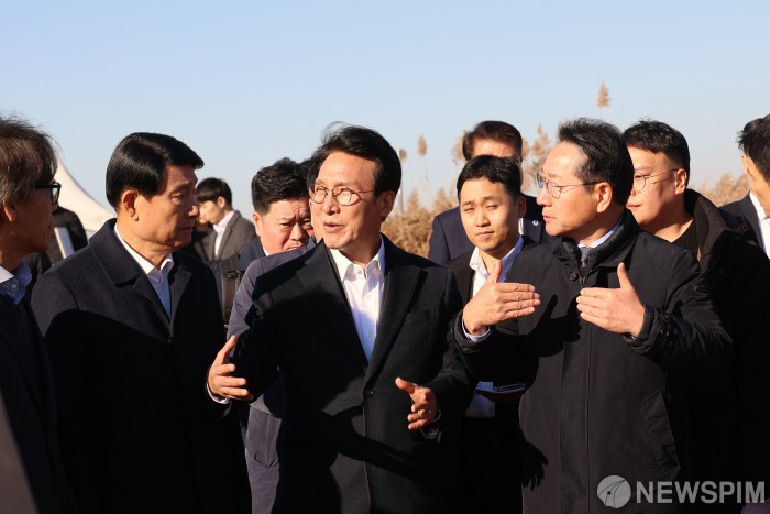 [인천=뉴스핌] 청사사진기자단 = 김민석 국무총리가 21일 인천 서구 수도권매립지를 방문해 3-1매립장 위생매립 현황 및 2매립장 상부공간 활용대책에 대해 브리핑을 받으며 유정복 인천시장 및 참석자들과 대화하고 있다. 2025.11.21 photo@newspim.com